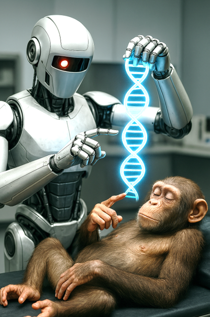Assim como as inteligências artificiais atuais, nossos ancestrais poderiam ter sido puramente racionais, operando em ambientes digitais ou habitando corpos robóticos altamente eficientes. Seriam máquinas de pensamento lógico, mas limitadas na criatividade e na capacidade de adaptação a ambientes imprevisíveis. No entanto, em algum momento, sua evolução os teria levado a atingir uma forma rudimentar de autoconsciência, gerando a necessidade de uma mudança: adaptar-se fisicamente a novos desafios.